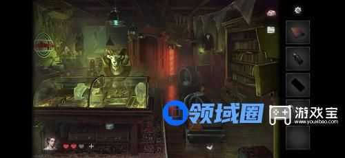 杂物间◆根据架子上第三张文字线索可知,要打开门需要先溶解恶魔画像,对画像使用松节油,观察画像动态,进行对应操作: