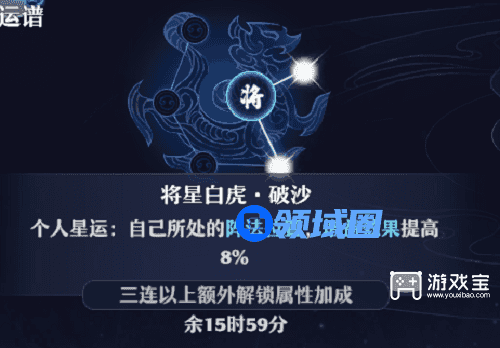 星运:输出位祈福阵法效果加成;封辅位祈福对应的灵兽亲和(水、毒、火)。