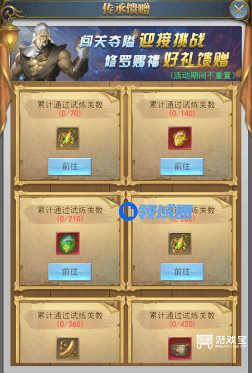 活动期间,累计通过试炼关卡数达到指定要求即可在传承馈赠界面领取对应馈赠奖励