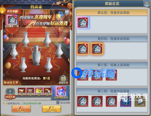 每次命中周边普通壶则可直接获得道具奖励,而投中特殊壶可进入到下一层并刷新奖励。层数越高,奖励越丰厚!