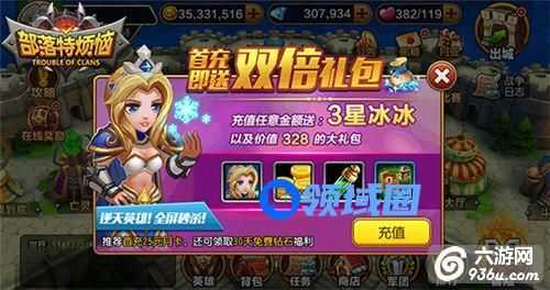 2、首充福利:首充奖励向来都是物超所值的,《部落特烦恼》更是如此,除了可以获得双倍的钻石,还有强力英雄3星冰冰免费赠送!而首充月卡更可每天领取20个钻石,持续一个月共计600钻赠送!