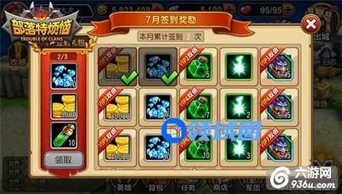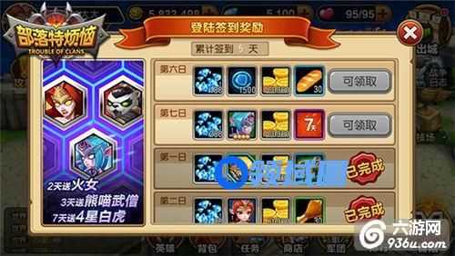 3、签到获取:《部落特烦恼》的签到系统也是福利多多,只要每天上线进行签到就可拿到钻石奖励,同时与游戏中还有累计签到奖励,当总签到次数达到一定数量,又会有大量的钻石相送!