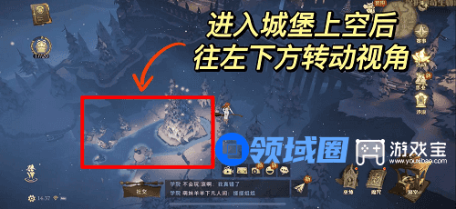 1、进入城堡上空后,往左下方转动视角,飞下去。