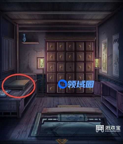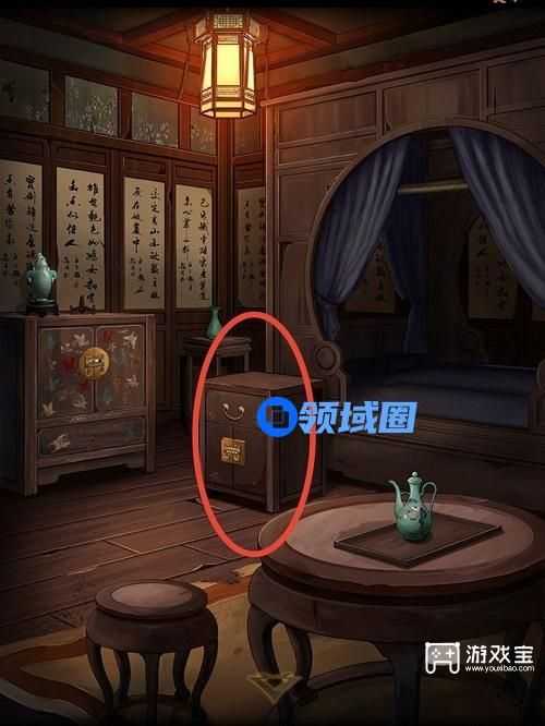 18、进入卧室,点击红圈处箱子,根据书房中卷轴线索打开箱子,得到扇面和床上的线索