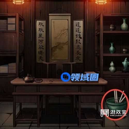 13、将玉净瓶和柳枝(左厢房得到)放在菩萨的手上,打开右边的门,进入书房,点击红圈得到线索