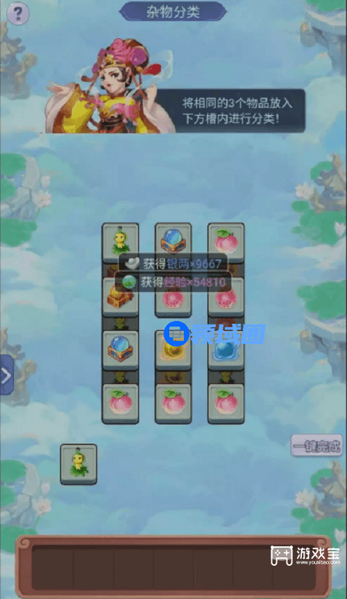 第一关消消乐,也叫羊了个羊,找出3个一样的物品就可消除,但要注意下方格子的空余数量。