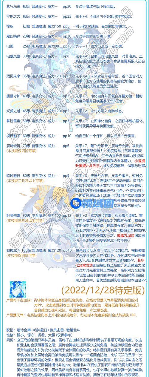 3、简析:玄玉岛的第四只奉神灵兽,雷鸣千古血脉的多种机制提供了非常可观的肉度,攻击和受击时会获得覆雷之尾;展诗会舞被动提供部分控制免疫,防控持续回合内还会提升技能威力并为变化技能赋予全体回血的效果;鸣钟蔽日拥有高先手恐惧,免疫恐惧冰冻加上展诗会舞的被动免疫可以当作一个短回合防控,比较亮眼的是第一次出现了屏蔽环境的效果;翻灵击雷会调整双方强化并造成伤害,同时根据覆雷之尾层数追加固伤或回复驰援北斗的pp:驰援北斗在提供了消耗和续航的同时还附带了类似控制之眼的效果,因此虽然自身有普系属性,也不必担心破茧杀戮一类的威胁。青钟翻狐的登场也意味着天梯阵容即将迎来洗牌。期待它在明年格局中的表现吧。
