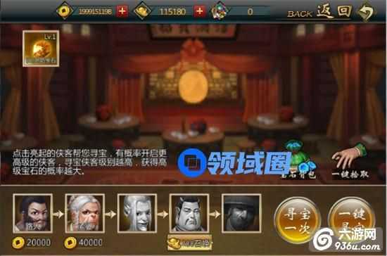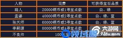 游戏中的宝石均是以“龙泉寻宝”功能获得的。点击“龙泉剑魂”主界面的“龙泉寻宝”按钮,就可以进入到寻宝界面了。从路人到不良帅,点击前一个头像,就有几率点亮后一个头像。点亮头像后,花费一定铜币或元宝就能进行寻宝了。