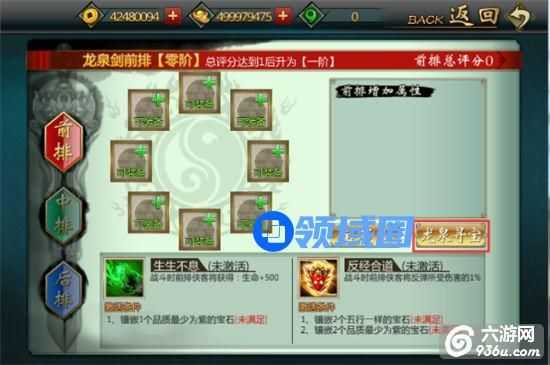 当前、中、后排分别达到5000时,龙泉剑升为升到2阶,会出现代表前中后位置的绿色剑魂环绕在龙泉剑周围: