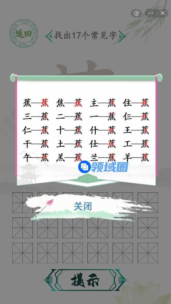 大家理解整体的思路就好,总之就是在蕉字上的焦字上多下点文章,焦字的各个部位拆解一下,然后和草字头组合就可以找出很多其他的汉字了,只要大家想象力足够,就不愁过不了这一关。