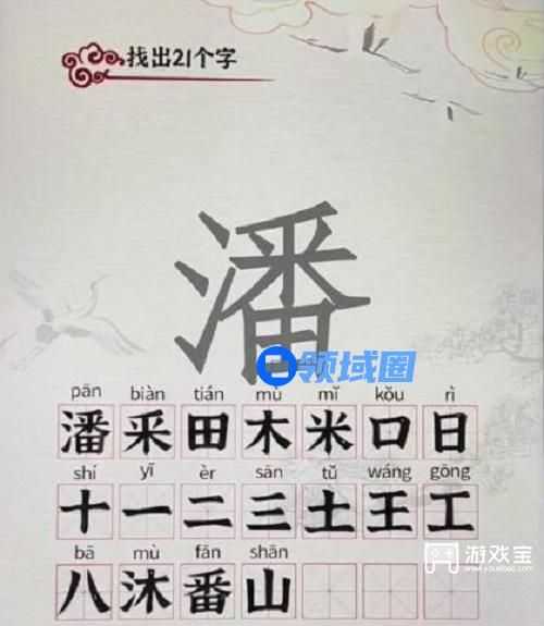 汉字派对潘字关卡中,需要玩家从潘字上面找出21个汉字后才可以通关,那这21个汉字是哪些呢?游戏宝小编带来汉字派对潘找出21个字攻略,一起来看看吧。