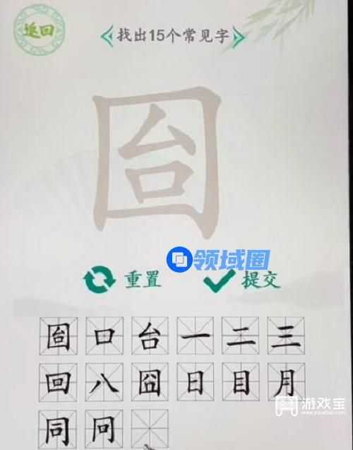 2、不知道这15个字是哪些的,可以参考上面的答案在囼字上面写出对应的汉字然后提交,写满15个后就可以通关了。