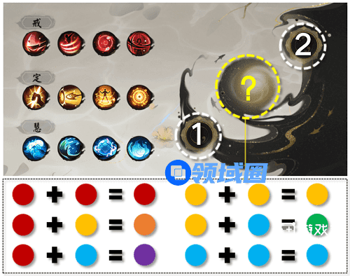 活动技能:红色4个+黄色4个+蓝色4个,每两种颜色组合后会生成1个新技能,类似调色盘