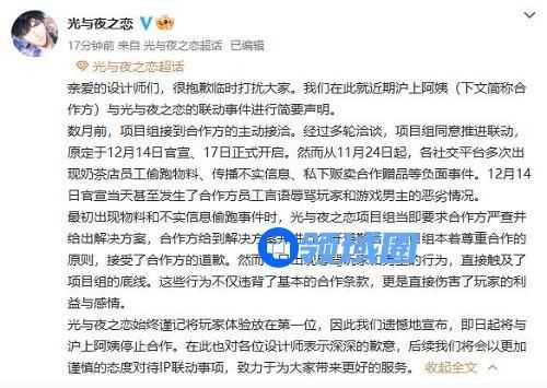 1、2022年12月14日上午手游《光与夜之恋》宣布与奶茶品牌「沪上阿姨」开启联动,而下午《光与夜之恋》再次发布公告,宣布停止合作。