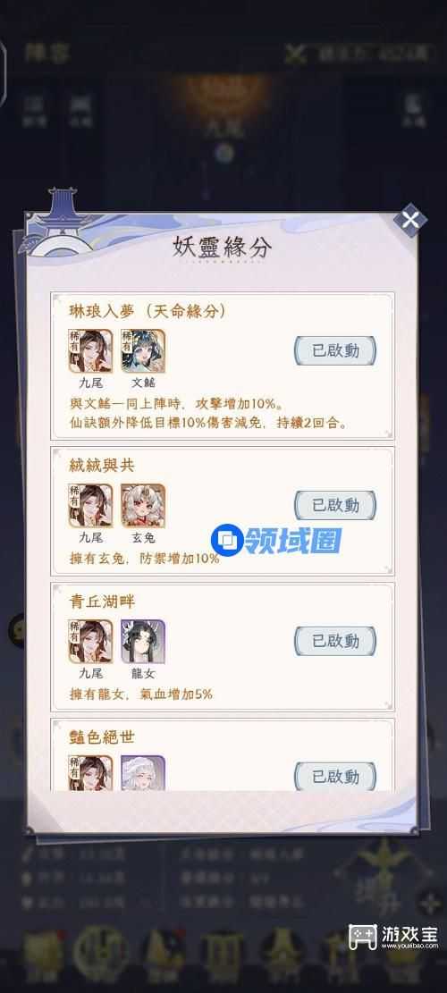 3、所以一般都是2+2的组合(比如我使用的是九尾文瑶+霸下睚眦,九尾和文瑶具有天命缘分,霸下和睚眦具有天命缘分)。