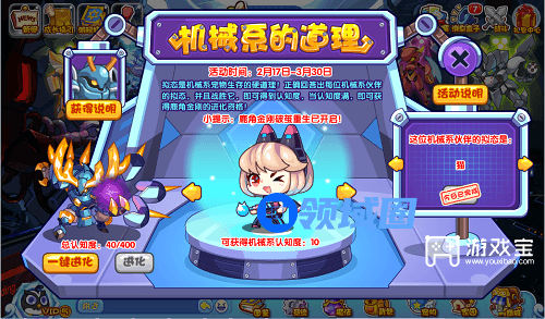 3、活动每天有四只机械系的宠物登场,需要小洛克们从宠物中选择与右侧中的拟态关键词对应的形态,例如:小小喵宝儿——猫。正确就会触发挑战,战斗胜利可以获得认知度,不同宠物可能存在不同的认知度,后续游戏更新为准。
