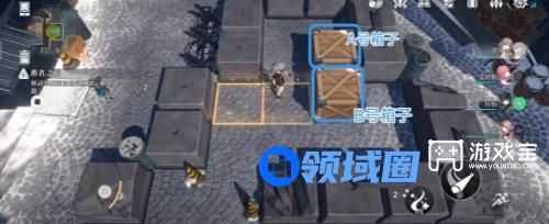 2、如图所示,将两个箱子分别标记为“A号箱子”与“B号箱子”,先把B号箱子向左移动2格,A号箱子向下移动1格,然后向右移动1格,即可完成。