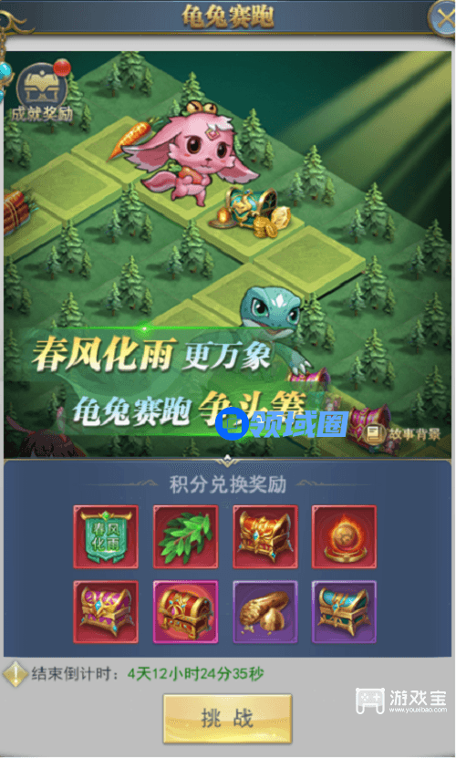 活动期间可进行多次龟兔赛跑比赛,达成赛跑成就任务目标,可领取成就任务奖励