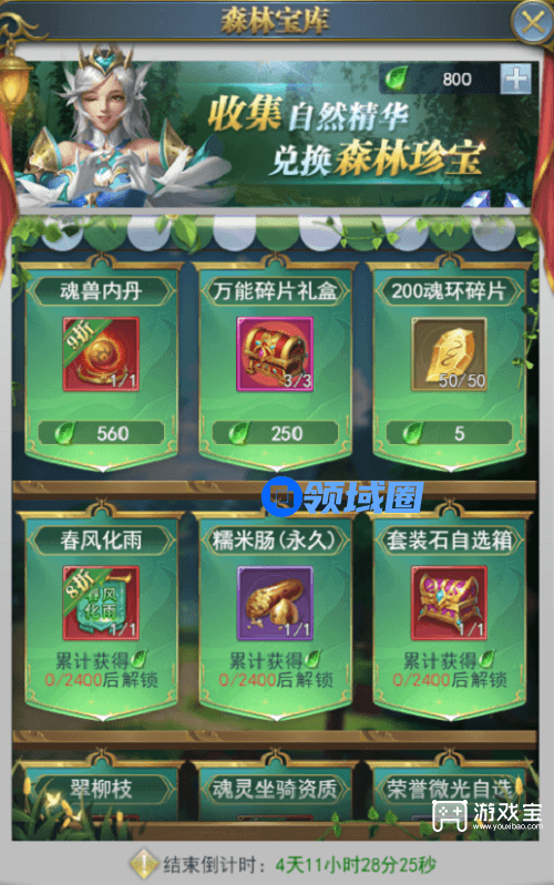 活动期间限时开放森林宝库,消耗森林精华可兑换珍稀奖励