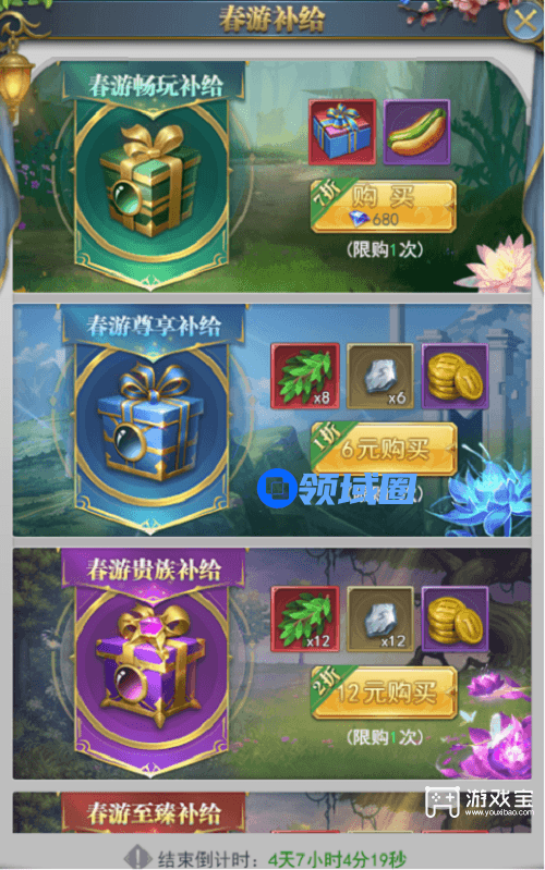 活动期间,可在春游补给中购买多档春游礼包,助力踏春访友,礼包有购买次数上限