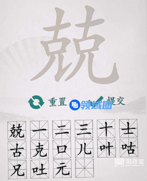 1、兢、一、二、三、十、士、古、克、口、儿、叶、咕、兄、吐、元、见。