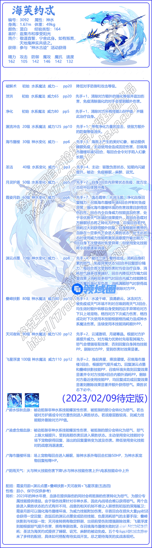 3、简析:2023年的神水年费,血脉在提供限伤的同时会将抵御的伤害转化为怒气,为部分专属技能提供增益。由于限伤效果针对非神水系,因此内战场合难以获得怒气。两个血脉进入乘胜状态的方式有所不同,战意的相关机制不难让人联想到初版的深海鲨卫;霞姿月韵可以强化海巿蜃楼环境,为威力技能附加伤害。非首回合在损失大量pp时还会获得一定回复;改版后的渊云点墨变成防控技能,也是消耗怒气的主要手段;叠嶂扶影则与初版一致;天河夜转拥有稳定群删,出招前受伤则增强删除效果;飞星浮渡则能根据怒气提升伤害,拥有单删效果。在召唤海市蜃楼失败时还会赋予对方额外损耗;圣洁为海芙约忒提供了睡眠、诅咒、麻醉的被动免疫。五个专属技能和双血脉带来了多样的配招,具体如何搭配有待实战开发。总之期待海芙的实战表现吧。