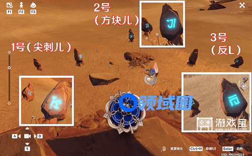 通过观察可以发现:这些石碑为三组,每组通过一前一后两块石碑组成,其中靠后的石碑图案固定,而前方石碑可以通过——角色击打、仙灵靠近改变图案。