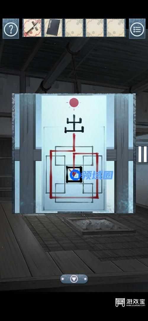 2、打开柜子以后用刀划开,得到符咒和场地,根据书里的内容反向操作,正常按照符咒首字来读,应该是来春去冬,反过来就是冬去春来,把冬去春来输入到场地里,减轻门上的力量,然后根据从大的符咒开始按反过来,就是从小的符咒开始点,从小到大点完以后门开,剧情。