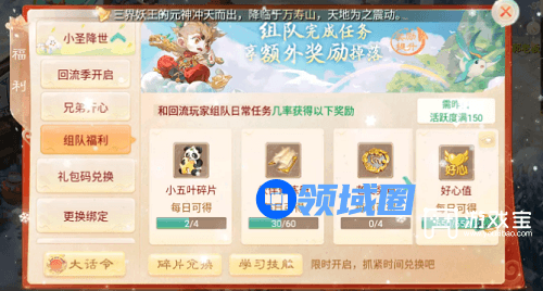6、【组队福利】小五叶碎片(获取总量、概率提升 2变成4)、蠃鱼精魄(获取总量、概率提升 2变成4)、伙伴修炼册(获取总量、概率提升 30变60)。好心值650 变色灵宠召唤券(有机会获得变色召唤兽)