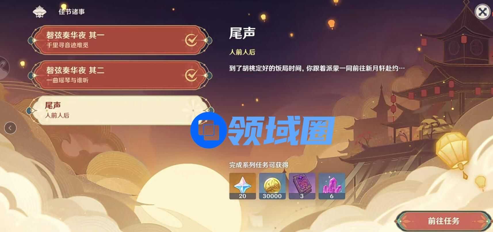 原神人前人后任务怎么做,这是3.4海灯节的尾声任务,最终的目的只有一个就是蹭堂主的饭,到了胡桃定好的饭局时间,玩家跟随着派蒙一同前往新月轩赴约又会遇到各种各样的事件,小编给大家介绍一下整体的流程。