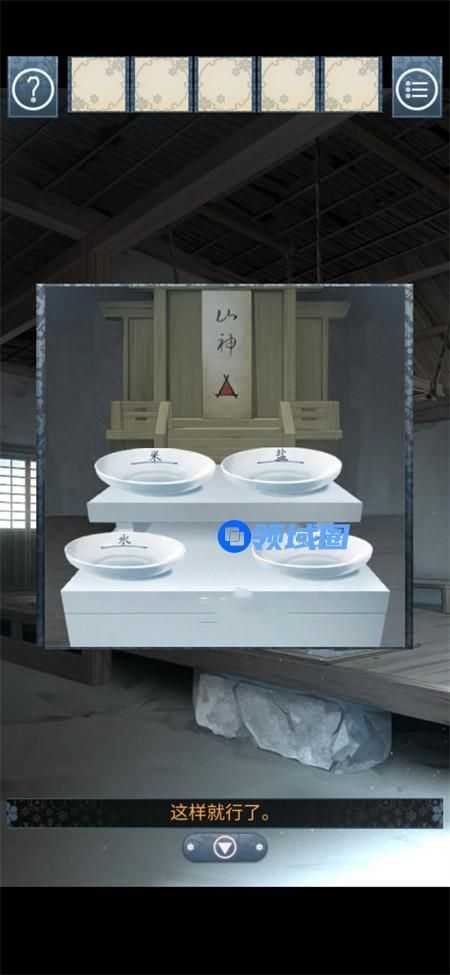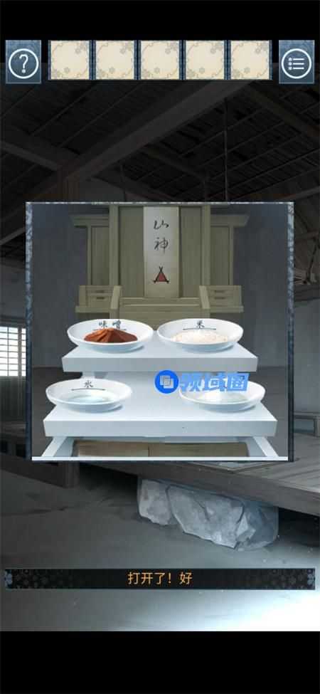 2.就近原则,先来到厨房把架子上的盐和灶台上的米装好,然后来到井边装上水,最后来到有一幅画的房间装上味增,不要着急回去,再去看看游戏最开始的地方,发现三个果实后面有图案,点进去以后记下来,然后回到拿衣服的房间