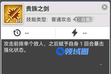 1、普攻-贵族之剑:攻击前排单个敌人,之后自身1回合暴击强化。