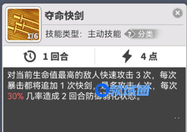 2、主动-夺命快剑:对生命值最高的敌人快速攻击3次,暴击将会追加一次攻击,最多攻击6次,每次30%造成2回合防御弱化。