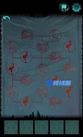 1、拿下路标上的布,根据路标和挂在树上的图案提示得到[右上右右]走出树林(详见图)