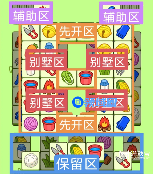 3、必要时可以用紫色盲盒区辅助消除,盲盒区后期不用留太多,留几张备用即可。