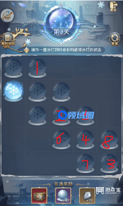 2、不知道怎么过的按照上面的顺序点就可以过关了,场上所有冰灯均处于点亮状态时即视为通关成功。