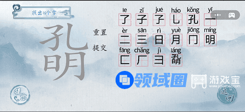 汉字梗传孔明关卡需要玩家在孔明字上写出16个汉字后才能通关,哪这16个字是哪些呢?游戏宝小编带来汉字梗传孔明找出16个字通关攻略,一起来看看吧。