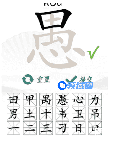 1、田、甲、禺、愚、心、力、男、土、十、韦、卫、吊、一、二、三、刁、日、口。