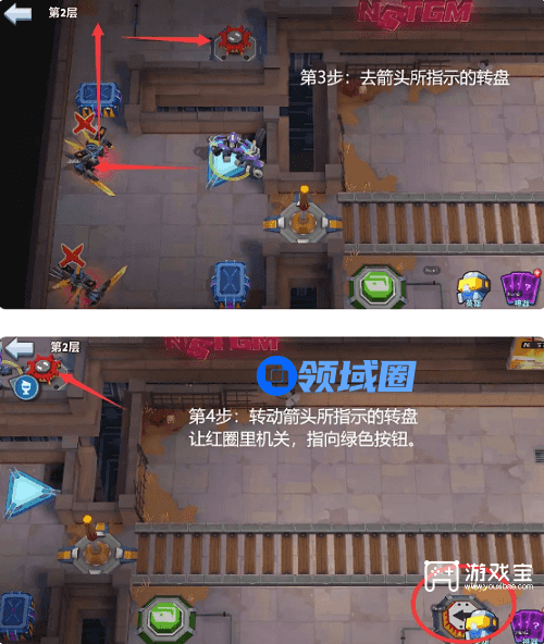 第4步,转动那个转盘,让轨道下面这个箭头机关,指向绿色的按钮。(如上图所示)