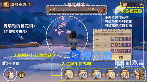 ②获取「春樱花瓣」 → 用花瓣兑换不同养料 → 捐赠养料