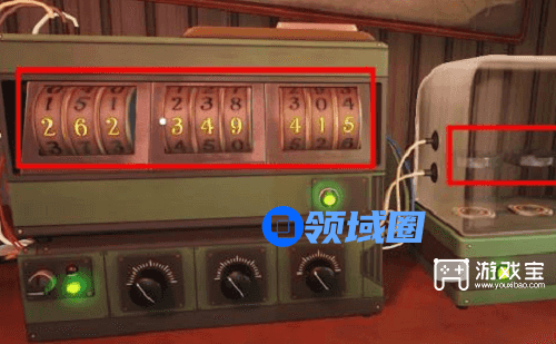 3、紧接着我们进入下图房间,完成探索以后,启动桌上的装置,旋转底部按钮将右侧的三款悬浮的磁片高度一致,就能获得数字密码【262、349、415】。