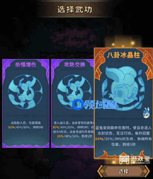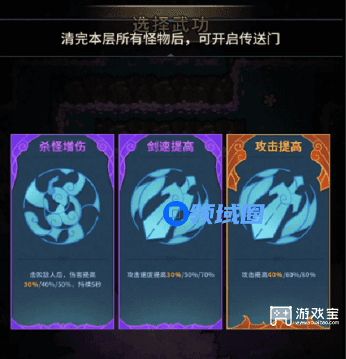 每次进关卡前会有随机蓝紫橙色三选一的武功供选择(右下方有头像的是对应角色的专属武功 不要选错了哦),回血 护盾武功是必选的,过图更稳。