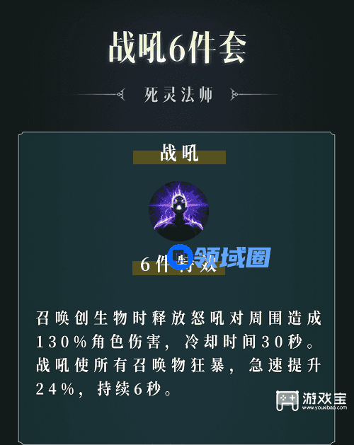1、6件套战吼非常契合死灵法师,它针对召唤物的独特灾厄增益效果,说是死灵法师的“专属增益”也不为过。