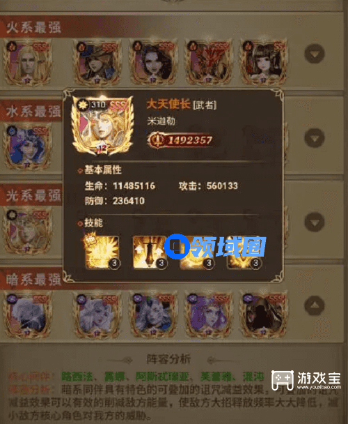 2、这个组合属于光系最强的阵容组合,大天使长属于这个组合中的核心,施展技能后可以对周围的目标造成超高的伤害,再配合上其他角色的辅助,让你快速击杀对手。