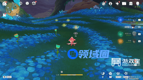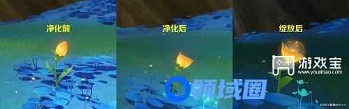 3.【关于绽放】完成净化之后,把时间调整至18:00~00:00,净觉花上方会出现「甘露游蜉」,受到角色攻击后会无法移动,用斯露莎触碰即可携带它(如果直接用斯露莎触碰,它会跑开),最后用携带甘露游蜉的斯露莎去触碰全部净觉花,完成绽放