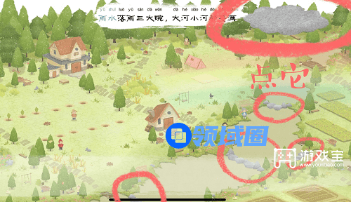 5.雨水来咯,点击乌云让它下雨后,再点击石堆,一共有四处,不要遗漏哦~等待小河充满雨水就可以进行下一步啦
