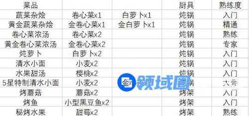 1、目前已知有蔬菜杂烩、黄金蔬菜杂烩、卷心菜浓汤、黄金卷心菜浓汤、炖萝卜、清水小面、水果甜汤、5星特制清水小面、烤蘑菇、烤鱼秘、烤水果11道菜品。