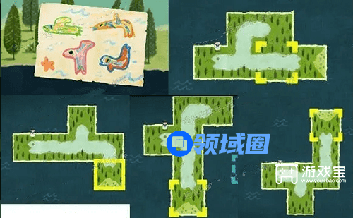 6、钓鱼比赛这里,直接跟每个NPC进行对话就能完成比赛。同时下面小男孩这里能获得新东西(所有鱼的图鉴,虽然画得非常艺术),记得对话获取,最后赢得比赛的方式就是把大地图的湖变成图鉴中四种鱼的形状,这里直接给出答案,完成一次正确的组合后,切回主角就会看见提示水中有些动静,之后靠近湖水钓鱼即可获得对应鱼(绿手套、黄金纸、红紧鲤、蓝土匪),四种钓上来就能赢得比赛。