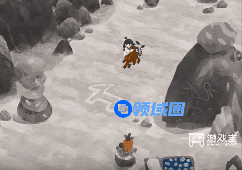 3、继续旅游,如下图。新区块的梯子下去。也要注意山羊标志要依照图中所示位置旋转区块放置。否则梯子下去后洞穴会无路可走。洞穴下去后完成对话,往左走,跟中姐对话,线索是需要候鸟原材料……上去准备候鸟。