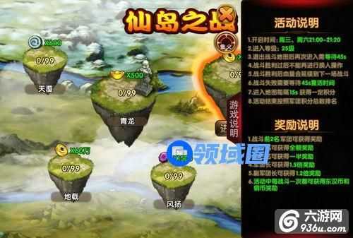 浮空岛——仙岛之战,开启的时间为周三、周六21:00-21:20,仙道之战奖励大量元宝、金钱、荣誉、魂玉、威望、名声、东汉币等各种币。其中青龙、白虎、朱雀、玄武为四大岛屿,是奖励最多的岛屿,值得一提的是军团长奖励1.5倍。